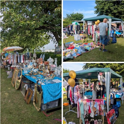 Zwischen schattenspendenden Kastanien- und Kirschbäumen luden liebevoll gestaltete Stände zum Stöbern ein. Angeboten wurden unter anderem gut erhaltene Kleidung, antike Möbelstücke, Spielzeug, Bücher und allerlei Kuriositäten – eine bunte Auswahl für alle, die gerne auf Entdeckungstour gehen.
