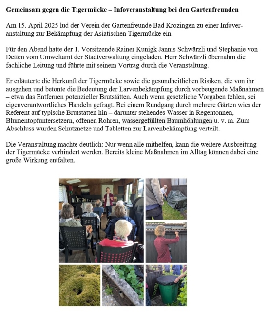 Lesezeit ca. < 1 Minute Gemeinsam gegen die Tigermücke Aktionstag Geschrieben von Der_Webmaster am Montag, 28. April 2025
